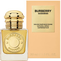 Burberry Goddess Eau de Parfum Intense-kampanjen fortsätter att följa Emma Mackey och en lejoninnas stolthet på sin resa till självupptäckt. Med förnyad styrka och självförtroende är Emma ett förkroppsligande av Burberry Goddess ande. När solen går ner hämtar hon styrka från dess strålar och släpper loss kraften inom sig. Denna Burberry-doft är en gourmandisk och aromatisk träig doft. Signaturtrion av vanilj från Goddess Eau de Parfum förstärks med ett fjärde vaniljträ (vanilj SFE), som har en rökig karaktär. När den kombineras med lavendelessens intensifierar den med en livlig träig doft. Burberry Goddess Eau de Parfum Intense är inspirerad av färgerna vid solnedgången och den är inrymd i en fyrkantig flaska fylld med en ljus bärnstensdoft dekorerad med en gyllene medaljong. Mörkbeige förpackning med en gabardininspirerad guldetikett refererar till varumärkets arv. Burberry Goddess Eau de Parfum Intense är designad för att fyllas på. Refill säljs separat.