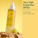 Vinosun Very High Protection Sun Water SPF50+ ger ansikte, kropp och hår ett effektivt skydd mot UVA-/UVB-strålar och har även en antioxidant verkan för att skydda den allra känsligaste huden. Formulan – hälften vatten, hälften olja – är berikad med granextrakt, polyfenoler och E-vitamin. Solskyddet är snabbabsorberat utan en fet känsla, har en osynlig finish och efterlämnar en mild sommardoft på huden. En ren och havsvänlig formula för hela familjen (från tre år och upp)! Dermatologiskt testad. Testad på känslig hud.