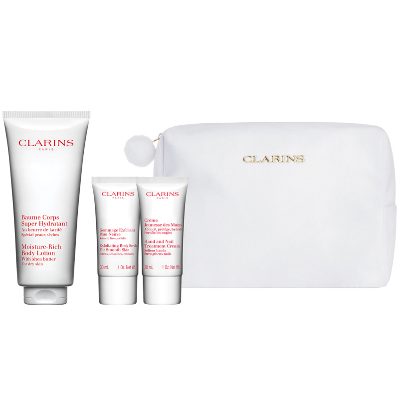 För att eliminera döda hudceller, använd Exfoliating Body Scrub for Smooth Skin med bambupulver en gång i veckan. Eftersom mjuk, strålande hud börjar med exfoliering är det det första steget i alla effektiva skönhetsrutiner. Avsluta med den ikoniska Hand and Nail Treatment Cream, ett måste från Clarins som inte bara återfuktar och mjukgör händerna utan också stärker naglarna. Alla dessa produkter förvaras i en vacker påse tillverkad av 87 % återvunna fibrer.