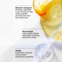 - C-vitamin: Detta serum är tillverkat med två typer av C-vitamin - magnesiumaskorbylfosfat och askorbylglukosid - i en exakt kalibrerad formulering. Tillsammans hjälper dessa potenta, ljusande antioxidanter synligt att minska mörka fläckar, inklusive märken efter föroreningar, och få hudtonen att se mer enhetlig ut.