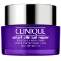 - Clinique Smart Clinical Repair Lifting Face + Neck Cream är en lyxig anti-age-kräm för ansikte och hals, som kliniskt dokumenterat minskar rynkor och fina linjer, ger huden en synlig uppstramning och jämnar ut rynkig hud på halsen. Denna kräm är berikad med multipeptider som stärker huden och stöder den naturliga kollagenproduktionen, vilket får huden att se mer uppstramad ut och minskar synligheten av rynkor och fina linjer. Samtidigt säkerställer hyaluronsyra, jojobaolja och sheasmör omedelbar och långvarig fukt, ger mer fyllighet, förbättrar smidigheten och suddar ut fina torrhetslinjer.