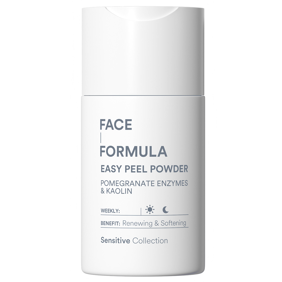 Face Formula Easy Peel Powder är en skummande enzympeeling som avlägsnar döda hudceller och tilltäpptheter. BHA-syra reducerar torra områden och löser upp tilltäppta porer, kaolin djuprengör, exfolierar skonsamt, och absorberar överskottstalg, fermenterat granatäppleextrakt, rikt på probiotika, stödjer hudens mikrobiom som ger antioxidativt skydd och främjar en mer balanserad och strålande hud. Peelingen är utvecklad för att minska glans, förebygga orenheter, samtidigt som den bevarar fukt och stärker hudbarriären. Huden lämnas balanserad, klar, med en jämnare hudton och förnyad lyster. Passar alla hudtyper, även en känslig hud.