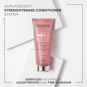 Kérastase Fondant Cica Chroma är ett stärkande balsam mot poröst hår för alla typer av sensibiliserat eller skadat, tunt till medeltjockt färgbehandlat hår. Denna lätta, ljusrosa kräm, berikad med aminosyra och centella asiatica, kan penetrera hårets kärna för att jämna ut poröst hår, återfukta och stärka håret från insidan, för att bevera en livfull färg. Penetrerar hårets kärna och ger 86 % starkare hårstrån*. 92 % av färgens intensitet är bevarad även efter 6 veckor**. *Instrumentellt test **Instrumentellt test: Bain Chroma Respect + Fondant Cica Chroma. Våra balsamflaskor är tillverkade av 45 % återvunnen plast.