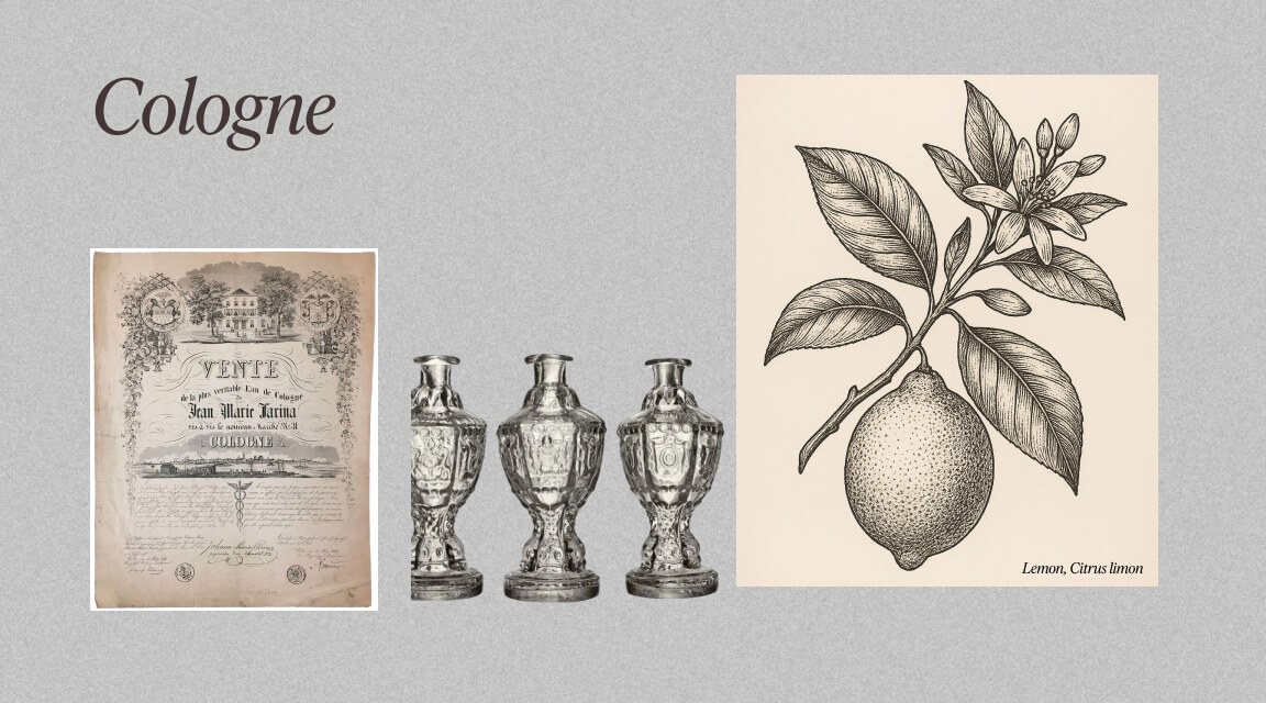 Eau de Cologne är både en koncentration (som Eau de Toilette, Eau de Parfum och Parfum) och en historisk stil från tidigt 1700-tal. Det “vatten från Köln” som skapades av Johann Maria Farina 1709 blev snabbt en europeisk sensation. Grunden är alltid citrus, kombinerat med medelhavsörter och blommiga inslag. Idag räknas cologner vanligen in under den nutida doftfamiljen citrusparfymer.