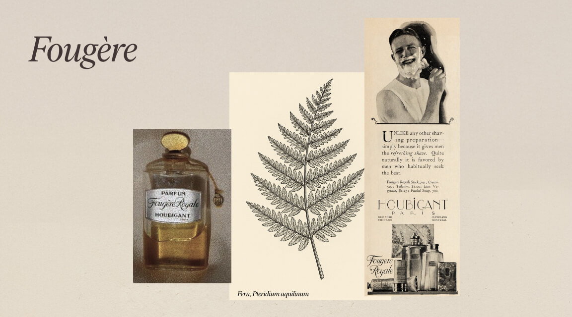 1. Historisk flaska av Houbigants Fougère Royale. Bild: CaFleureBon. 2. Historisk annons för Houbigant Fougère Royale. Bild: Period Paper-arkivet.