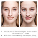 Ett lätt lugnande gelserum som kliniskt bevisat minskar utbrott på bara en vecka. Salicylsyra (1,0%) behandlar och förhindrar utbrott. Sebacicsyra kontrollerar oljig hud. Lysofosfatidsyra minskar synlighet av porer. Glykolsyra exfolierar. Hydroxydekansyra kontrollerar oljig hud. Honung, Boswellia och risextrakt lugnar.