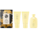 Den jacquardvävda gobelängen med titeln Golden Threads är ett mästerverk av ull, bomull, mohair och ädla guldbladstrådar, inspirerat av den ikoniska svartvita designen från Oribes Gold Lust-kollektion och Oribe Goddess-emblemet. Emblemets design inspirerade i sin tur Saksi till en tolkning av nordisk mytologi, särskilt hans skildring av den nordiska gudinnan Sifs gyllene, böljande hår. Genom en noggrann teknik och levande berättande firar Oribe naturens skönhet och hantverkets tidlösa kraft.