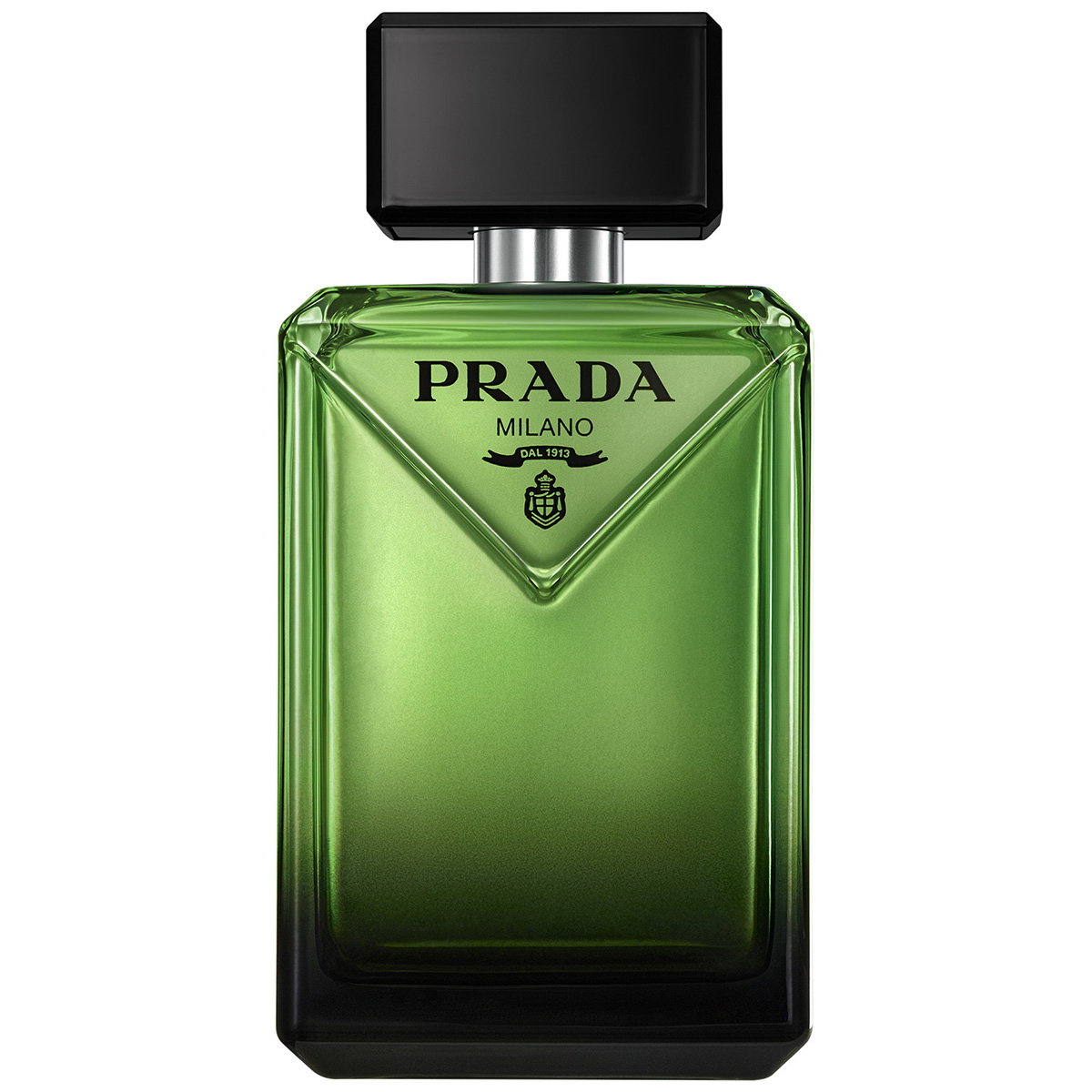 Paradigme-flakongen väcker omedelbart nyfikenhet. En arkitektonisk silhuett av radikal elegans mjukgjord av rundade kanter och ett avantgardistiskt uttalande genom den taktila, snedställda Prada-triangeln, husets ikoniska signatur. Flakongen är lackerad i en intensiv och förförisk gradering från svart till grönt, husets ikoniska färg. Den yttre asken är präglad för att spegla märkets signatur Saffiano-läder med korsmönster, signerad med en silverfärgad Prada-logotyp.