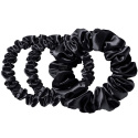 Innehåller: 2 x svarta medelstora scrunchies i rent siden, 1 x svart stor scrunchie i rent siden.